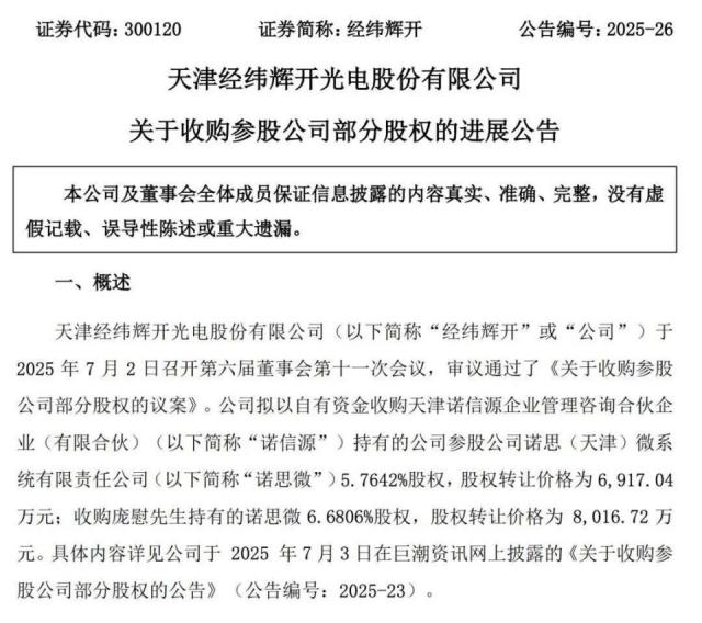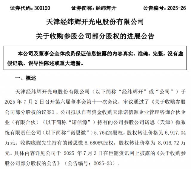 7 月 2 日晚间,经纬辉开 ( 300120.SZ ) 公告称,公司拟收购天津诺信源企业管理咨询合伙企业(有限合伙)持有的公司参股公司诺思(天津)微系统有限责任公司(以下简称"诺思微")5.76% 股权,交易价格 6917.04 万元;收购庞慰持有的诺思微 6.68% 股权,交易价格 8016.72 万元。此次合计收购诺思微 12.44% 股权。