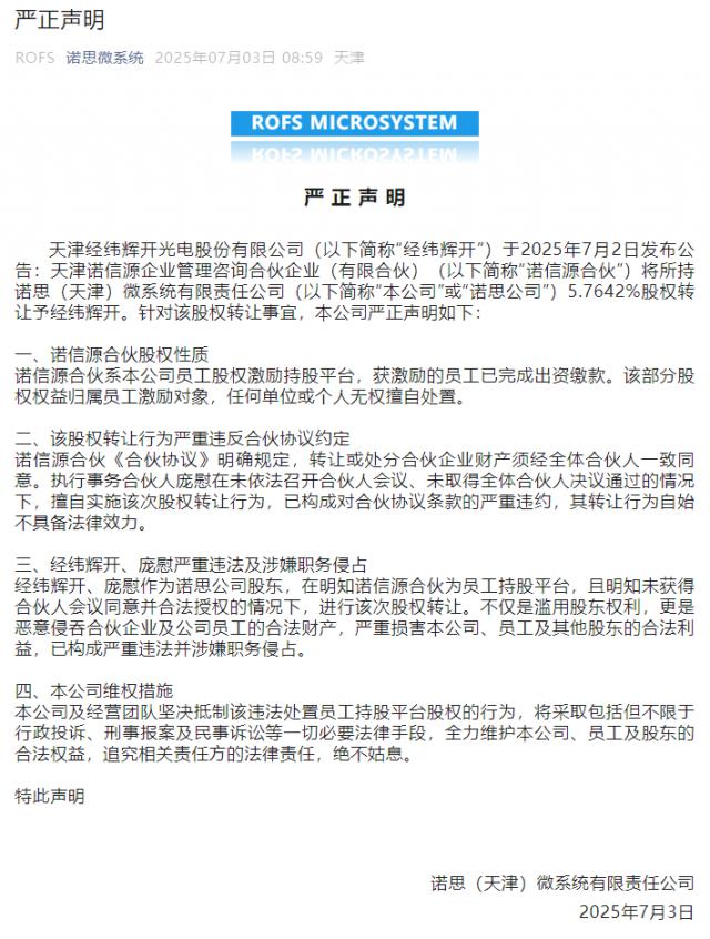 诺思微发"严正声明",称该交易"严重违法并涉嫌职务侵占"面对经纬辉开的收购,7 月 3 日,诺思微发布严正声明,指控经纬辉开"严重违反合伙协议约定",及"涉嫌违法及职务侵占"。
